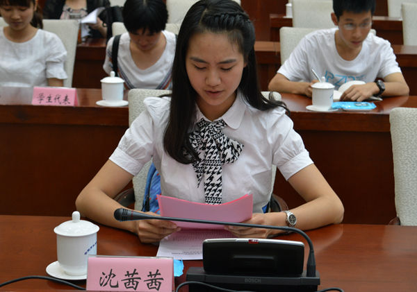 我校沈茜茜代表全市大学生在座谈会上进行发言,她表示当今时代日新月异,作为当代大学生要能够变被动为主动,革命先辈为我们创造了一个和平年代,我们要珍惜今天来之不易的美好生活。通过铭记历史纪念活动有助于培养当代大学生居安思危的意识,缅怀先烈,完善自身,团结协作,开创精彩的新未来。