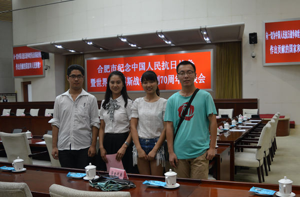 9月6日下午,合肥市纪念中国人民抗日战争暨世界反法西斯战争胜利70周年座谈会在市政务中心召开。省委市委领导出席会议并讲话。我校沈茜茜、程寿月、董浩、袁众、常文玉五位同学作为合肥市大学生代表参加了会议,沈茜茜并代表全市大学生在座谈会上进行了发言。